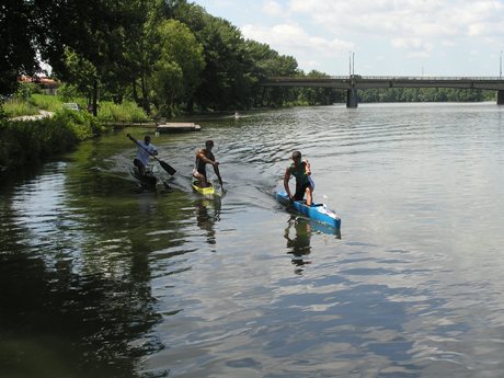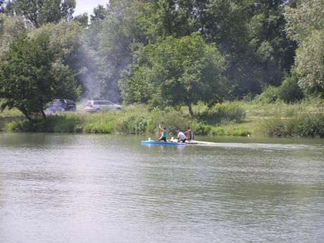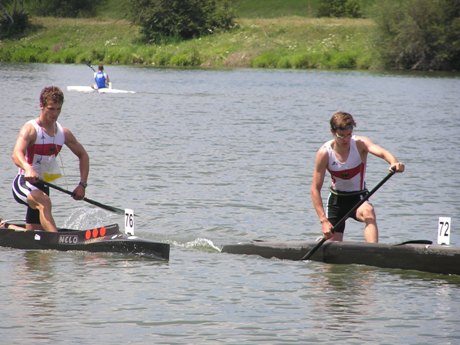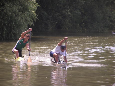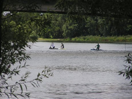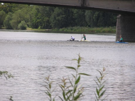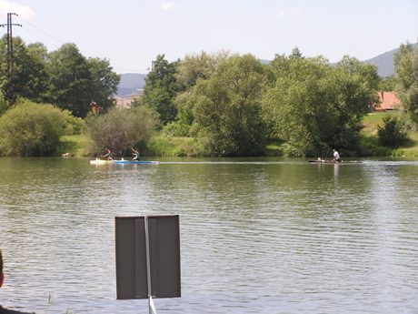 Ale tento záber je už OK, keďže som nefotil zo sedla bicykla :-). A je z neho zrejmé, že súboj o titul sa zúžil na dvoch pretekárov. Asi je to len náhoda, ale tretí v poradí akoby symbolicky položil pádlo, keď pochopil, že na vedúcu dvojicu už nemá.