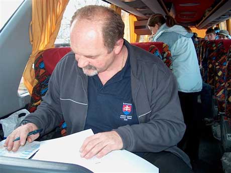 Tréner Ľubomír Hagara sa sústredene venuje nutnej papierovej administratíve na pohodlnom sedadle parádneho autobusu-mercedesu DAK KIABA Nováky.