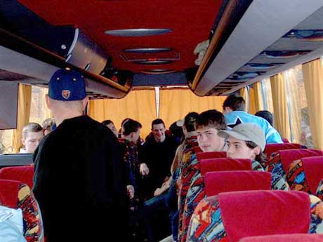 V zadnej časti autobusu už beží zábava a veselá debata na plné obrátky.